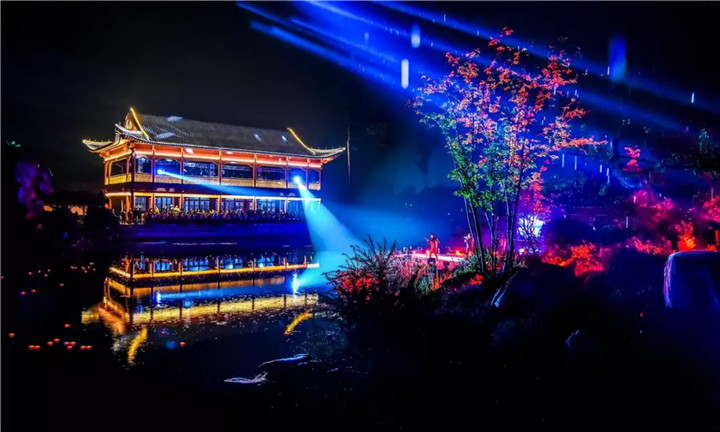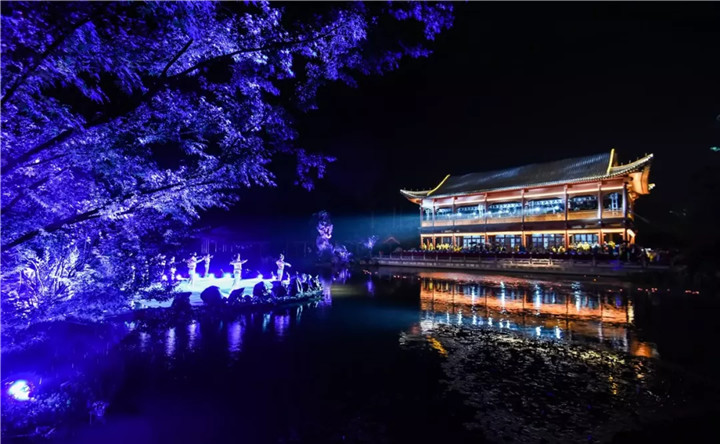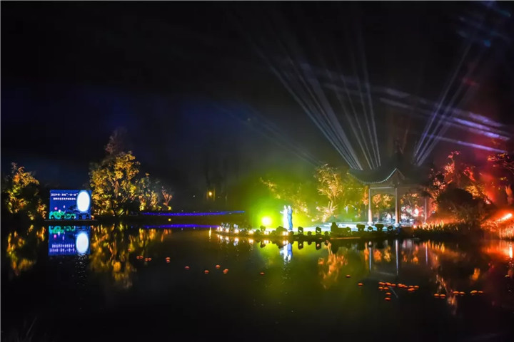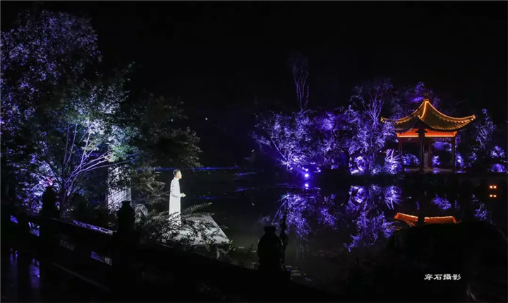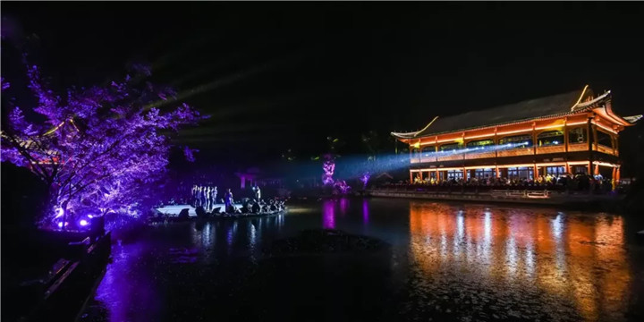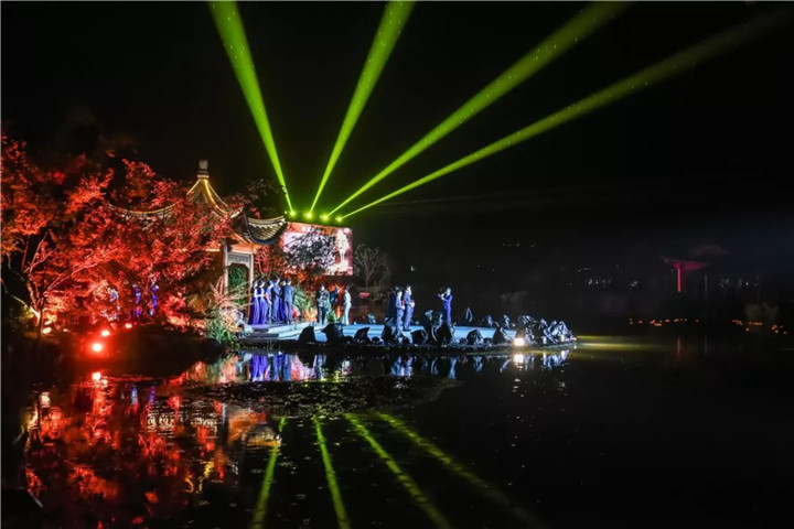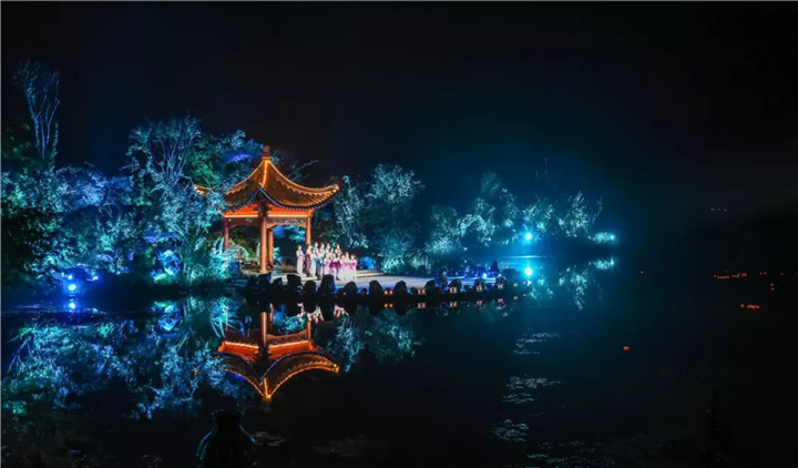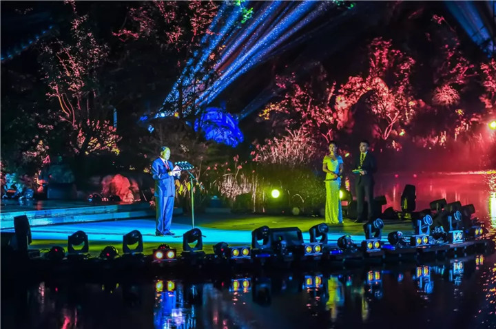頒獎(jiǎng)典禮上的園林實(shí)景版文藝表演,將節(jié)目的表現(xiàn)形式與亭臺(tái)軒榭橋舫湖及花草樹(shù)木充分結(jié)合,使藝術(shù)之美與自然之美在瓊島攬?jiān)律辖幌噍x映,相得益彰,令人沉醉。