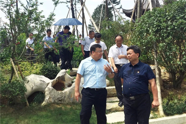 6月19日下午,江西省贛州市信豐縣委書記劉勇(左一),縣委副書記、縣長黃蕙(左四)帶隊100余人考察由浙江人文園林股份有限公司營造的安遠縣書香公園,安遠縣委常委、副書記、縣政府縣長肖斐杰(左二),城鄉規劃建設局局長魏明柱(左三)陪同。