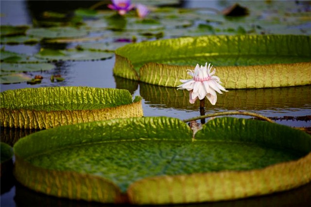 不僅葉子巨大,王蓮花的直徑最大也可達到40厘米。在夏天和秋天的晚上,王蓮悄悄綻放,花容多變,花期一般有三天,每天的顏色各不相同,第一天是白色,第二天變為粉紅色,第三天則變為紫紅色,然后閉合凋謝,沉入水中。由于這一奇特特性,王蓮也被人們稱為“善變的女神”。