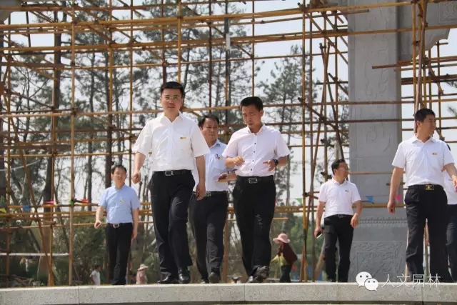 陜西省副省長張道宏(左二)到國家文史公園視察,韓城市市委書記、市人大常委會主任李智遠(左一)和韓城市市長褚錦鋒(右二),以及浙江人文園林有限公司副總經理洪利民(右一)陪同。李智遠書記為張道宏副省長詳細介紹了澽水河改造方案、韓城市污水處理計劃和文史公園的設計方案、施工進度,得到了張道宏副省長認可。