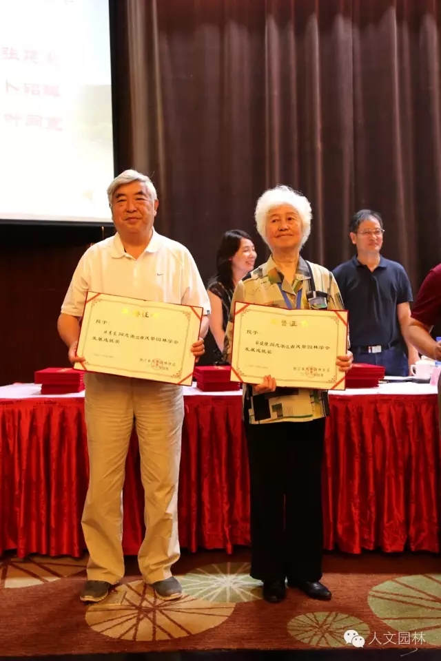此次大會(huì)中,園林伉儷施奠東先生和劉延捷老師獲得浙江省風(fēng)景園林學(xué)會(huì)“發(fā)展成就獎(jiǎng)”,榮獲此獎(jiǎng)項(xiàng)的還有林福昌、張延惠、陳樟德、馮祥珍、胡理琛、卜昭暉、劉茂春、宋玉琪、裘寶林、葉同寬、潘仲連等31名園林專家,以表彰他們?yōu)檎憬★L(fēng)景園林的發(fā)展做出的杰出貢獻(xiàn)。