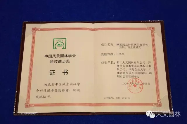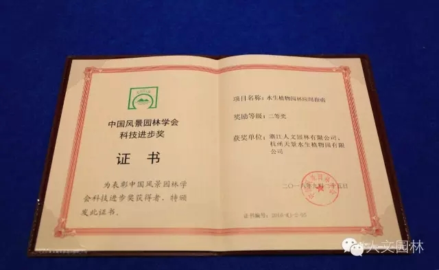 2016年9月23日~26日,2016中國風景園林學會年會在廣西南寧隆重召開,并頒發了2016中國風景園林學會科技進步獎,由浙江人文園林有限公司推出的“人文園林系列叢書”之《水生植物園林應用指南》,獲得2016中國風景園林學會科技進步獎二等獎,浙江人文園林有限公司等單位共同研究的“睡蓮屬品種性狀的特異性、一致性、穩定性研究”獲得2016中國風景園林學會科技進步獎三等獎。