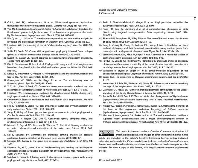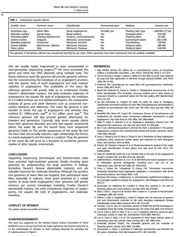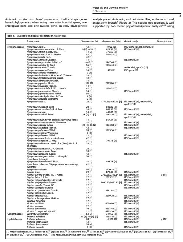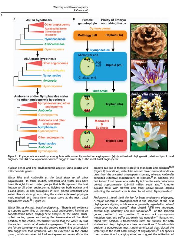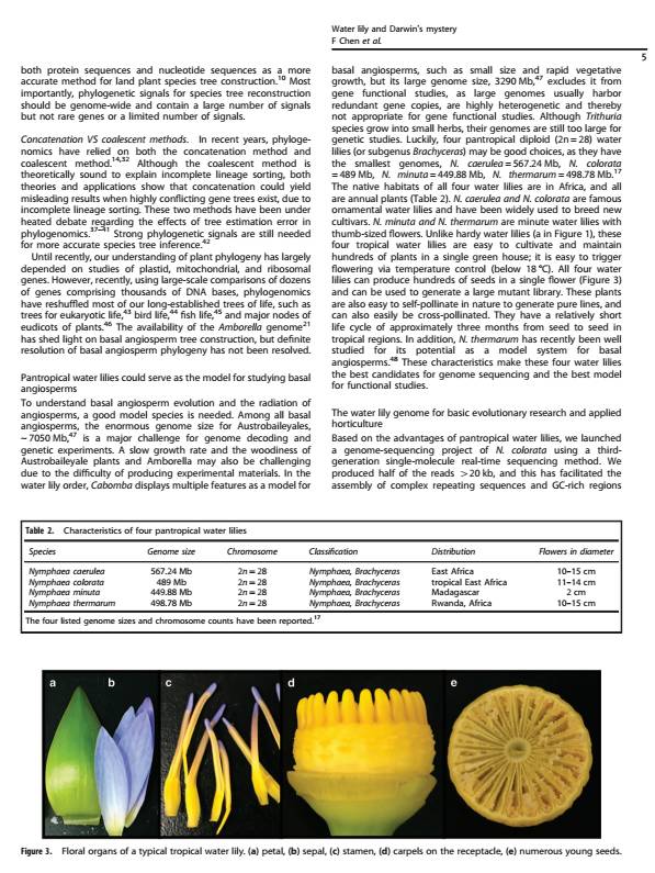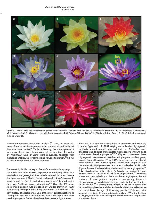 睡蓮基因組對于揭示觀賞性狀的遺傳學(xué)極有價(jià)值,睡蓮基因組的研究將大大加快睡蓮的分子育種,從而推動(dòng)睡蓮的應(yīng)用和產(chǎn)業(yè)化。除了觀賞功能,睡蓮還具有重要的文化和經(jīng)濟(jì)價(jià)值,而且占據(jù)了開花植物起源和早期進(jìn)化的關(guān)鍵位置。開花植物的誕生和快速輻射吸引了許多科學(xué)家,并被查爾斯·達(dá)爾文認(rèn)為是“可惡的奧秘”。該綜述回顧了睡蓮當(dāng)前的分子研究現(xiàn)狀,并提出睡蓮研究進(jìn)入基因組時(shí)代。該文提出,睡蓮的基因組是研究基部被子植物與達(dá)爾文“可惡的奧秘”有爭議的關(guān)系的關(guān)鍵。四種廣熱帶睡蓮中特別是近期張亮生教授領(lǐng)銜測序的藍(lán)星睡蓮,具有體量小,生長快,種子多等特點(diǎn),可作為研究被子植物來源的最佳模式物種。